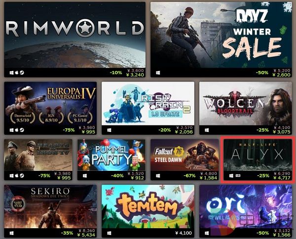 在Steam 2020年度最畅销游戏Top 100中,「半衰期:爱莉克斯」是唯一上榜的VR独占游戏,不过也仅仅位列青铜榜单中;另一款支持VR模式的游戏「微软飞行模拟2020」位列白银榜单,其余VR游戏均未能入围该榜单。