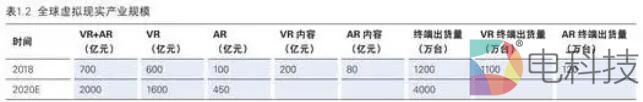 根据Greenlight Insights的预测,2020 年全球VR+AR 产业规模总计2000 亿元左右,其中VR1600 亿元,AR450 亿元,预计2020年全球终端出货量将达到4000万台。