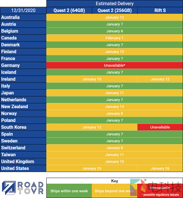 此外RoadtoVR公布了官方数据的Quest 2 64GB/256GB及Rift S头显在各国的发货时间,最新时间表显示大部分国家和地区都能在一到两周内发货,但是美国和加拿大地区的Quest 2订单却大量滞销,预计要等到1月下旬或2月初才能交付。