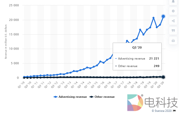 营收方面,Facebook目前的营收基本来源于在线广告收入,其2020年Q3财报显示,总营收为214.7亿美元,其中广告业务贡献了212.21亿美元。虽然Facebook正在拓展在线支付、游戏、电商以及VR/AR等新业务,但这些新业务加起来的营收比重只有1.2%。