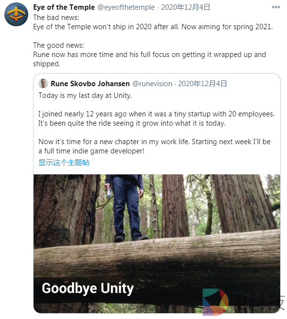 直至去年12月4日,Rune Skovbo Johansen还是Unity的高级软件工程师,而「Eye of the Temple」则是其在业余时间以独立开发者的身份开发的。通过「Eye of the Temple」的官推我们可以知道该作原计划在去年发布,而Rune Skovbo Johansen则表示在离开Unity之后,他就会有更多时间专注开发「Eye of the Temple」,并指出有望在2021年春季发布这款游戏。