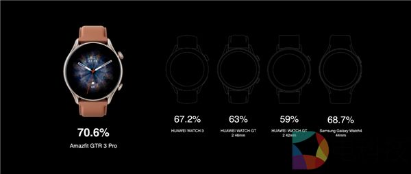 根据网上的拆机视频可以发现,此次Apple Watch S7能够实现更大屏幕、超窄边框,主要得益于采用曲率更大的2.5D弧面玻璃,在视觉上形成“满溢”的效果。相较于苹果取巧的方案,华米则是通过技术层面的创新,解决智能手表,尤其是圆形表盘屏占比难以做高的行业难题。通过更为先进的技术工艺,Amazfit跃我GTR 3 Pro将屏占比提升到了70.6%,高于行业平均值的67%,带来了极致的无边框屏幕体验。