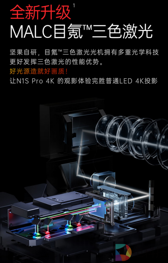 坚果N1S Pro 4K除了分辨率提升到4K之外,在画质核心的亮度参数上,也同样带来新的升级。N1S Pro 4K延续了坚果坚果自主研发的MALC 目氪™三色激光光机,采用的当下最前沿也最硬核的三色激光技术,并且在光路设计、合光&匀光以及成像显示全链路实现了探索创新,可以说目氪™光机是当今市场中最成熟的三色激光技术应用者。