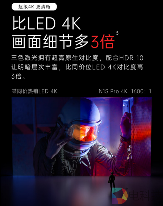 如果说光源决定了画质上限,那么分辨率则代表着你能把光源的上限激发到什么程度。因此,坚果N1S系列作为N1系列的升级款,除了延续了三色激光光源技术之外,最大的突破点,就是分辨率大幅度升级,直接来到了4K!
