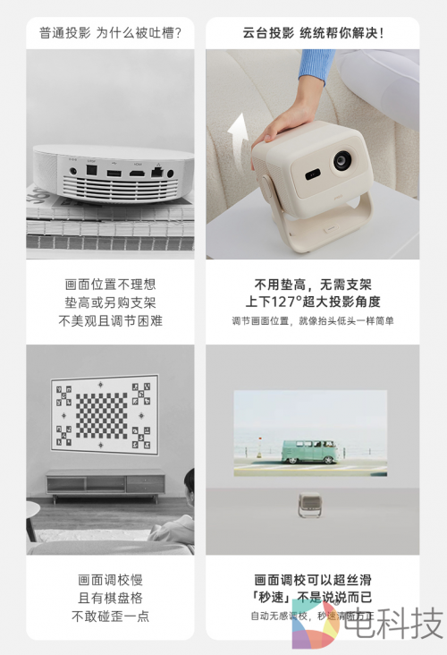 用过智能投影的人想必都遇到过这个问题,在使用投影仪的时候,如果将投影仪放在桌面上,那么投影仪的光路就很有可能会被桌面遮挡,投射出的画面就会不完整,非常影响观影体验; 但如果不想光路被遮挡,就需要通过对投影仪进行垫高、吊装甚至是壁挂来寻找完美的投影角度,这样的话,有掉落风险不说,还把智能投影仪便携和灵活切换场景的优势丢失了,可以说是得不偿失,尤其是对女性用户而言,频繁搬运和挪动投影仪本身就是不小的麻烦,而一体式云台设计正好解决了这个问题。