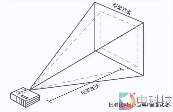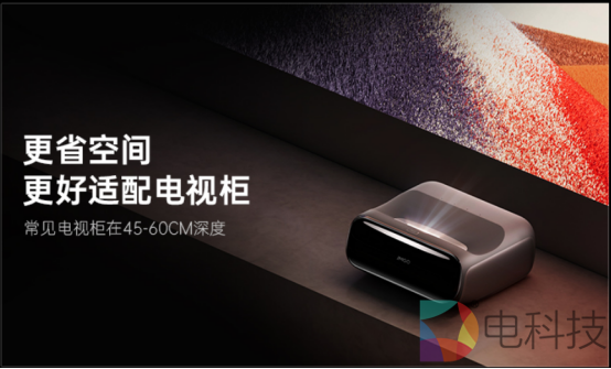 相对于画质差、价格高的硬伤问题,超短焦投影还面临摆放尴尬,场景适配低的问题。与市场中宣传的【贴墙投】不同的是,目前主流的超短焦投影投射比大多在0.3:1,而【激光电视】的投射比在0.25:1左右,需要明确的是,投射比越小代表着投射出同样大小的画面只需要更短的距离。