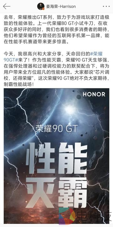正如荣耀终端有限公司中国区CMO姜海荣所讲,荣耀GT系列致力于为游戏玩家打造极致的性能体验,助力荣耀重返互联网第一品牌宝座。自上一代荣耀80 GT小试牛刀收获众多好评后,此次天命回归的荣耀90 GT更懂用户所需,打造“性能灭霸”级的诚意之作,以绝对实力制霸性能战场。12月21日新机登场,定不负大家期待!