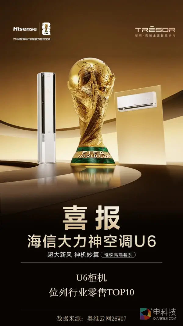 近日,奥维云网(AVC)公布2026年第7周空调零售监测数据,海信璀璨高端套系旗下大力神空调U6再传捷报,其柜机产品成功跻身行业零售TOP10,市场表现持续领跑。