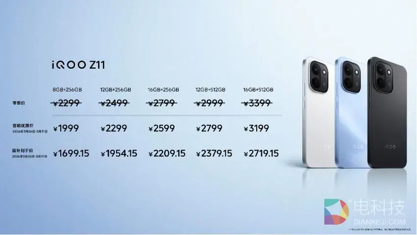 iQOO Z11 共有5个版本可供选择,8GB+256GB版本首销优惠价1999 元(零售价 2299元,国补到手价1699.15 元)、12GB+256GB版本首销优惠价2299 元(零售价 2499元,国补到手价1954.15 元)、16GB+256GB版本首销优惠价2599 元(零售价 2799元,国补到手价2209.15 元)、12GB+512GB版本首销优惠价2799 元(零售价 2999元,国补到手价2379.15 元)、16GB+512GB版本首销优惠价3199 元(零售价 3399元,国补到手价2719.15 元)。