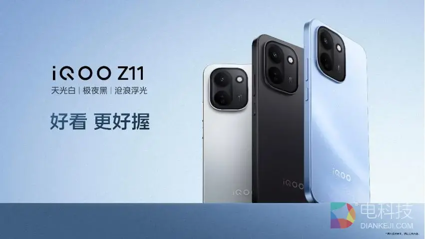 iQOO Z11x 同场亮相,主打 LCD 长续航护眼,具备“冰青绿”、“雪屿白”和“夜影黑”三款配色,采用大 R 角设计,外观优雅,握持舒适。