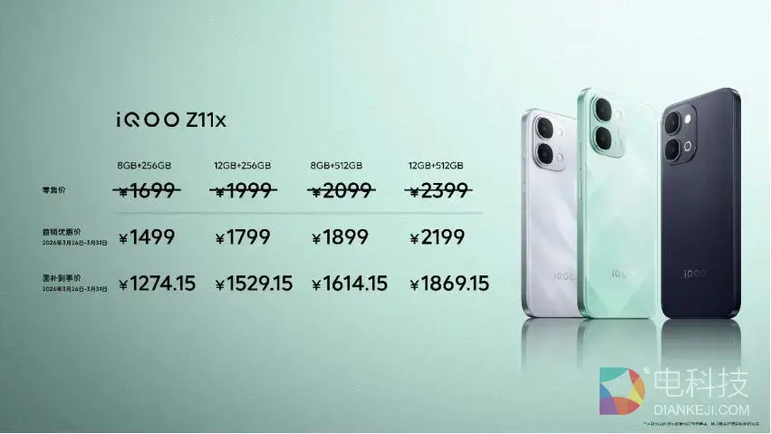 3月26日~31日为首销优惠期,首销前4天(3月26日~29 日)购买 iQOO Z11 和 iQOO Z11x,分别可享至高 6 期分期免息和至高 3 期分期免息,至高享超450 元互联网权益,购机还送价值 447 元服务保障全家桶(包含价值 89 元的 3 年电池宝、 价值 59 元的 1 年后盖宝和价值 299 元的 1 年进水宝)。首销期购机,还可享价值 129 元的碎屏宝买一年送一年和以旧换新至高补贴 1100 元。