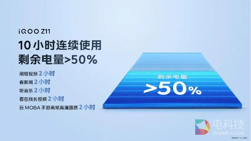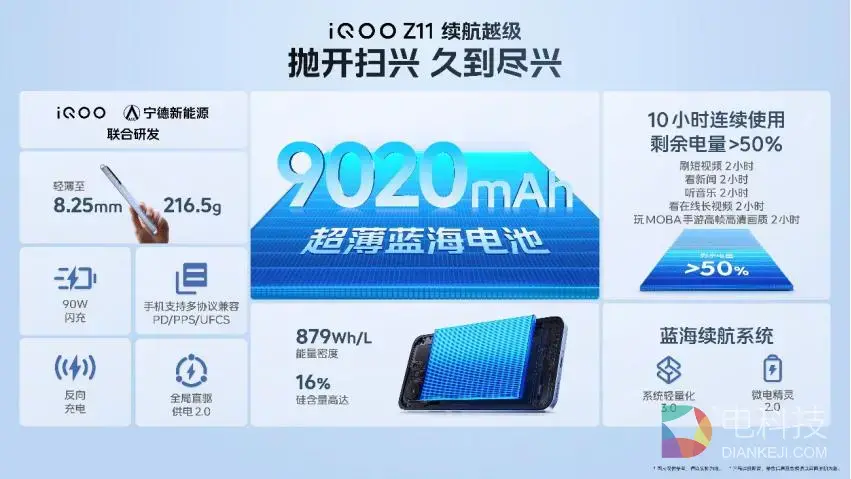 iQOO Z11 搭载 iQOO 史上最大的 9020mAh 超薄蓝海电池,采用与宁德新能源联合研发,具备硅含量高达 16% 的全新第四代硅负极,以及能够实现低温持久续航的全新第二代半固态技术,能量密度突破 879Wh/L,续航实力轻松爆表。全新蓝海续航系统拥有微电精灵 2.0 和系统轻量化 3.0,不但待机功耗更低,还能凭借疾速满血复活功能,电量接近耗尽时插电即恢复游戏原界面,关键时刻绝不慌神。