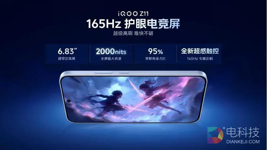 iQOO Z11 搭载 6.83 英寸 iQOO 首款 165Hz 护眼电竞屏,拥有专为 165Hz 优化的全新超感触控、更低拖影的 95% 首帧亮度占比、2000nits 全屏最大亮度,以及 600nits 下的更低功耗,还支持 2160Hz 高频 PWM 融合调光和全亮度类 DC 调光,搭载游戏护眼 2.0,并通过 SGS 低蓝光认证和 SGS 低频闪认证,以及全家桶护眼方案呵护用户双眼。