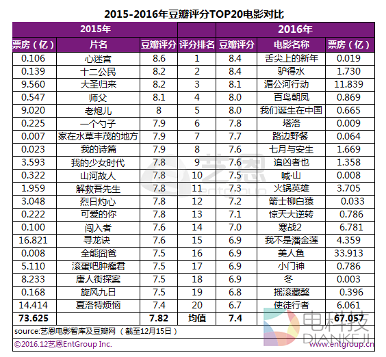 观众在电影的选择上似乎更加理性了,这种理性体现在他们对电影的选择中。相对于很多平台上被操纵或阉割的评分,豆瓣评分在一定程度上能反应观众对电影的满意度水平,我们不妨看一下2015年和2016年国产电影的豆瓣评分。截至12月15日,2015年度上映的国产电影中,评分为7分以上的有27部,而今年仅有14部,仅为去年一半。详细看一下TOP20评分的电影,可以看出,今年国产电影头部质量明显低于去年。