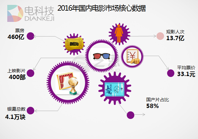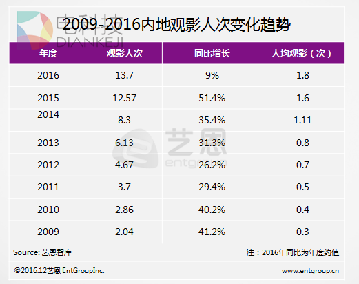 2016年国内市场在2015年度爆发的基础上,虽然票房增速放缓,但核心数据指标上仍显示出稳健的增长: