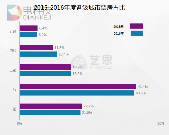 6、基于硬件设备的扩容,2016年城市票房中,四线城市表现亮眼,增幅最大(1.56%),一二线城市票房占比(62.19%)较2015年度(63.55%)下降1.36个百分点,三线城市表现较为稳定;