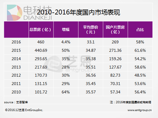 2016年最终票房"不出所料"的未迎来突飞猛进的增长,累计票房在460亿左右,增幅约为4.4%。2016年电影市场增长趋于理性,不管是"遇冷"还是增长"拐