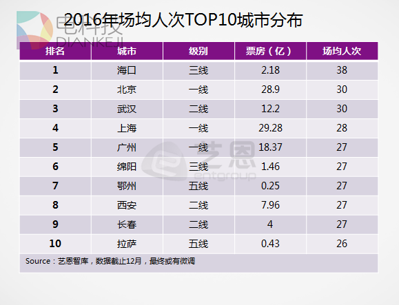7、在场均人次指标中,海口以38人/场的成绩领跑众城市,且五线城市鄂州、拉萨进入TOP10榜单;一线城市中,深圳的成绩则仅为21人/场。因此部分接近于饱和的一二线城市中,影院经营模式需进行多元化调整提升影院上座率,三四线甚至五线城市影院建设,则需要数据指标进行综合选择,防止盲目扎堆进入;