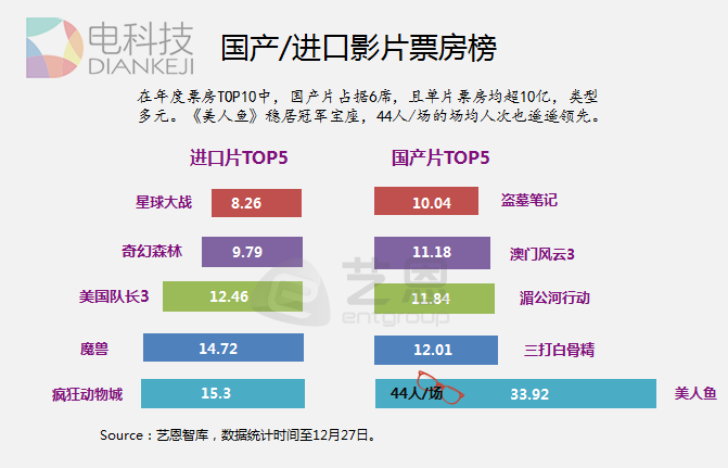 4、首次诞生超30亿单片,国产片《美人鱼》(33.92亿)登顶内地票房冠军宝座。2015年度则诞生了两部超20亿单片,《捉妖记》(24.39亿)和《速度与激情7》(24.26亿);同时月度票房成绩由2015年7月55亿跃升2016年2月份近69亿,国内市场容量足够,仍有待释放;