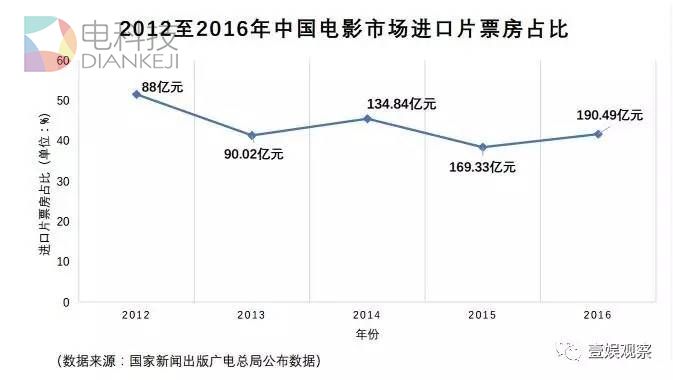 2012至2016年中国电影市场进口片票房占比