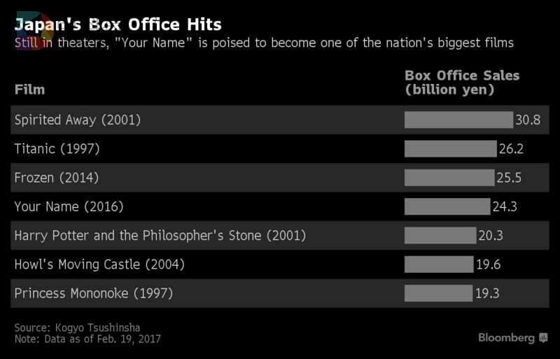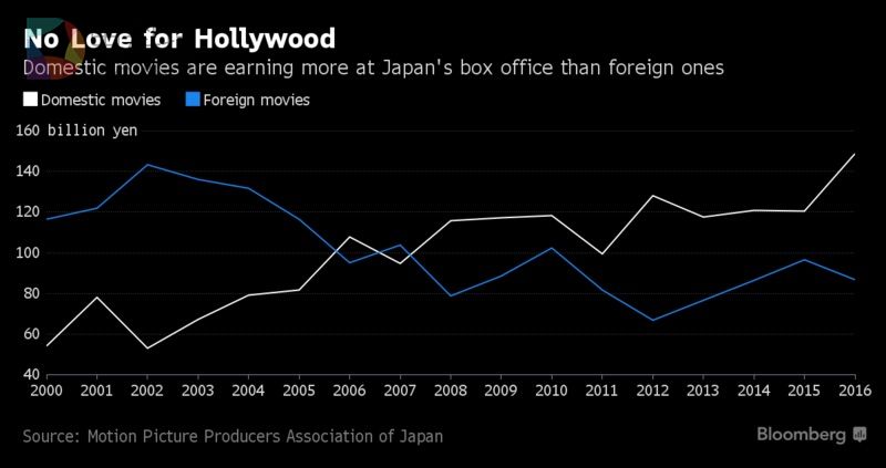 根据日本电影制片人协会公布的数据,好莱坞电影在日本票房的份额,从 2015 年的 44.6% 下跌到 36.9%。堪称每一帧都美得可以做墙纸的《你的名字。》,以 242 亿日元(截止至 2017 年 2 月)成为日本史上国内票房第二高的本地电影,仅次于 2001 年《千与千寻》斩获的 308 亿日元。