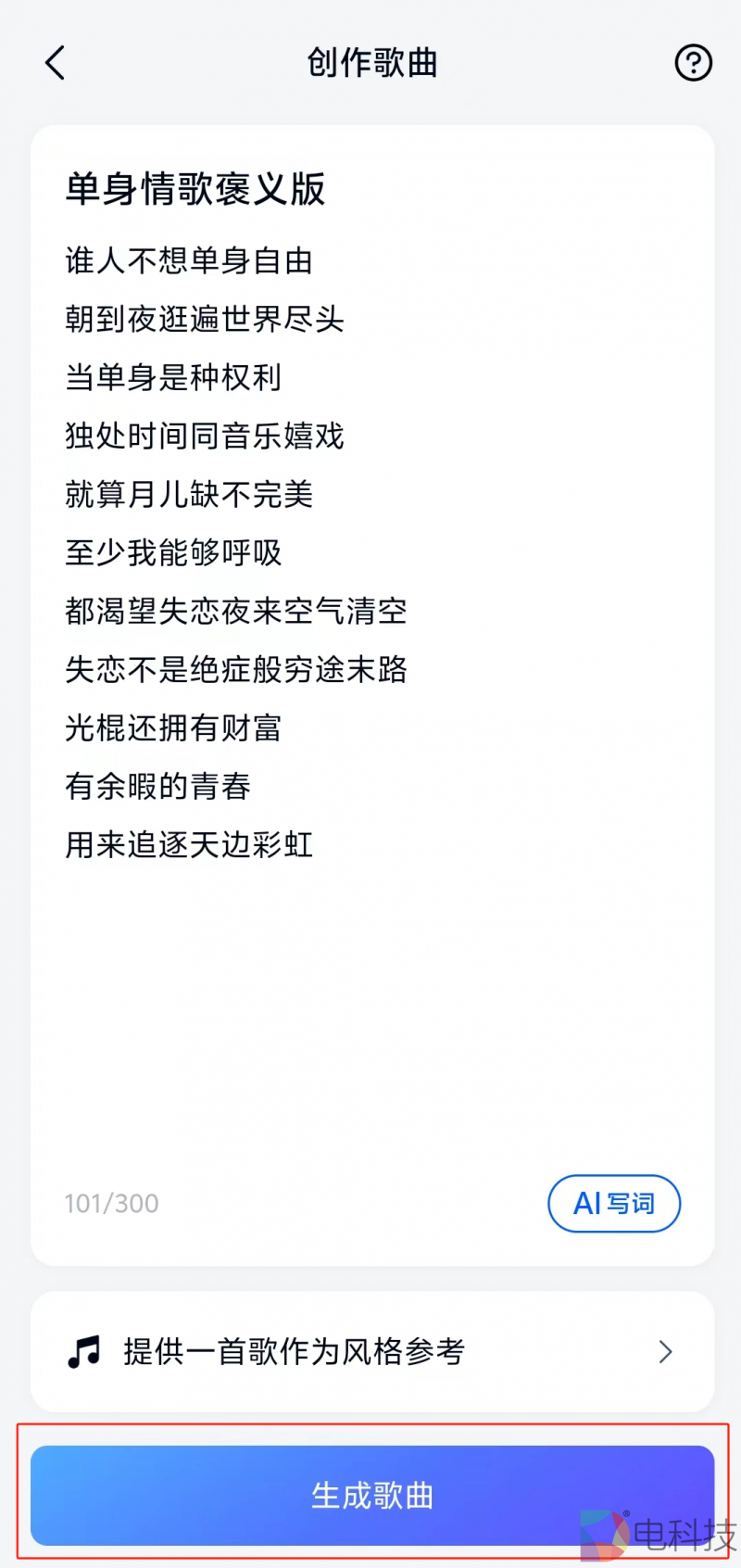 「天工SkyMusic」正是考虑到这一点,所以在填写歌词的界面加入了“AI写词”功能。我们只需要输入歌名和一句想要表达的情感,它就能继续为我们创作歌词。无论是浪漫的爱情、励志的友情还是深沉的自我反思,它都能轻松驾驭。