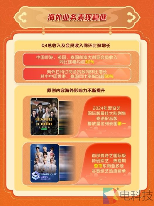 根据爱奇艺2024年过往财报显示,爱奇艺海外业务已连续四个季度实现总收入和会员收入的同环比双增长。其中,第四季度中国香港、英国、泰国和澳大利亚会员收入同比涨幅均超30%;会员规模方面,海外日均订阅会员数同环比增长,中国香港、泰国同比涨幅均超50%。