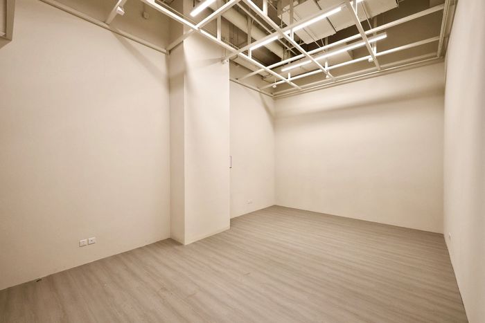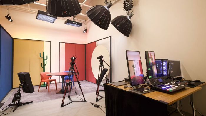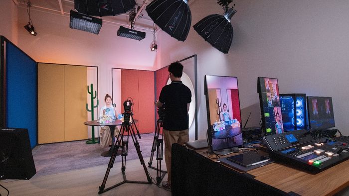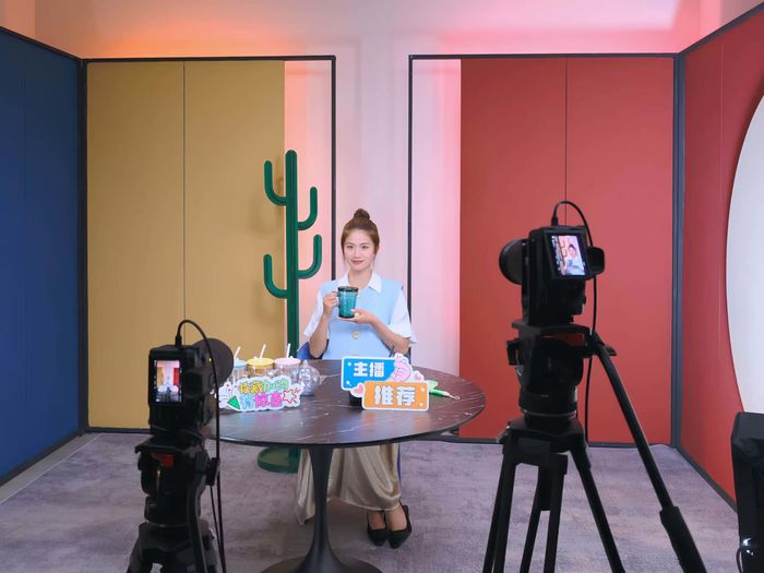 场景设计:选用品牌色系的轻量化材质,采用吊顶方钢提升空间利用率,同步优化声学环境,打造专业影棚质感;