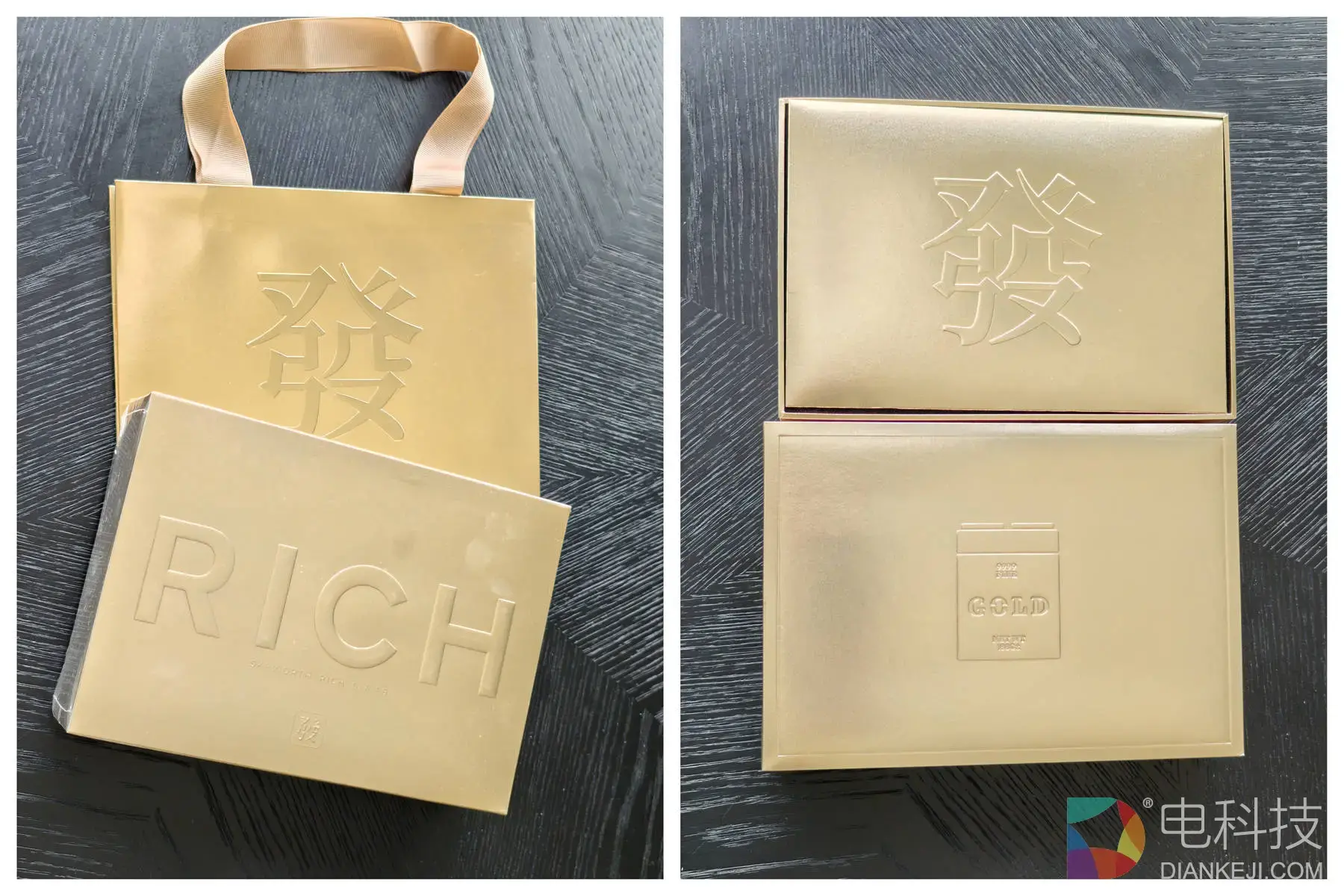 刚拆封就被这个分量惊到,沉甸甸的压手感完全不像普通塑料剃须刀。外层牛皮纸盒印着几何纹和一个 “發” 字,撕开塑封才是重头戏,全套哑光鎏金礼盒搭配同色系缎面手提袋,浮雕的 “RICH” 和 “發” 字凹凸有致,不用额外包装,拎去送人都自带高级感。