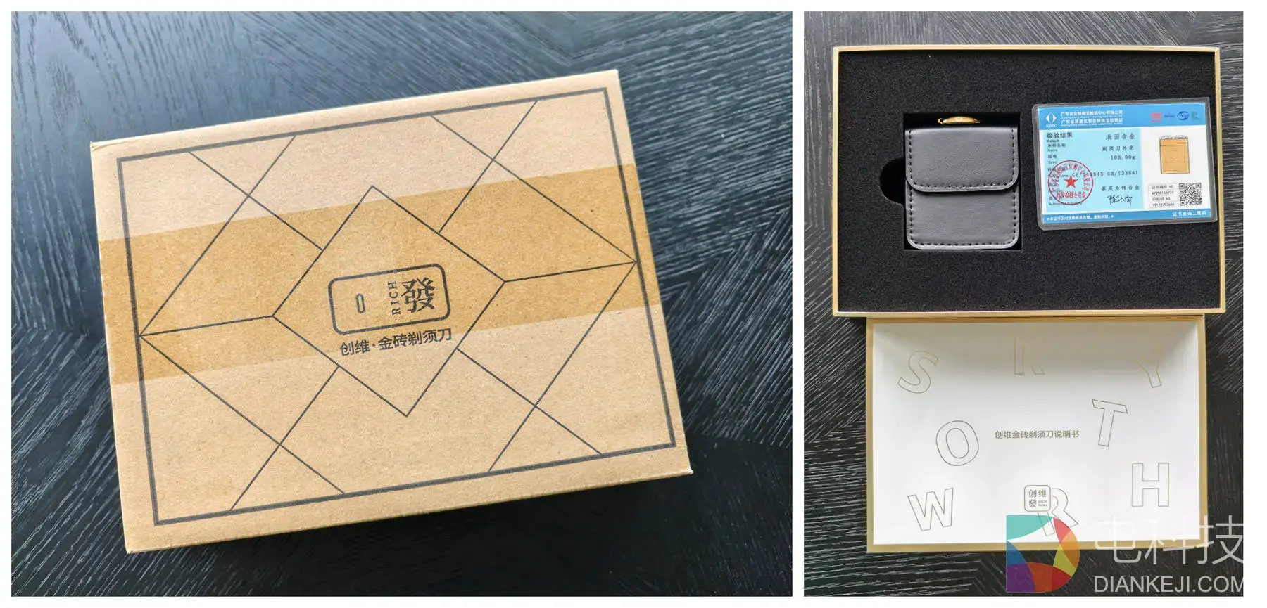 掀开盒盖,黑色高密度植绒海绵把每样配件都卡得严丝合缝。除了剃须刀本体和细腻的皮质收纳套,最绝的是居然附带了广东省金银珠宝检测中心的正规证书!明明白白标着 “表面含金”,还有专属二维码可扫码验真。那一刻,我手里这玩意儿瞬间脱离了 “小家电” 范畴,变成了一块带证书的 “小金砖”,拿在手里盘的底气都足了不少。