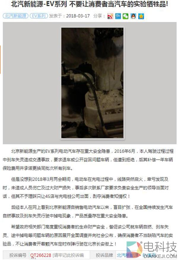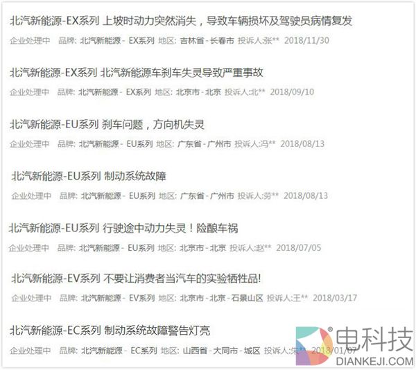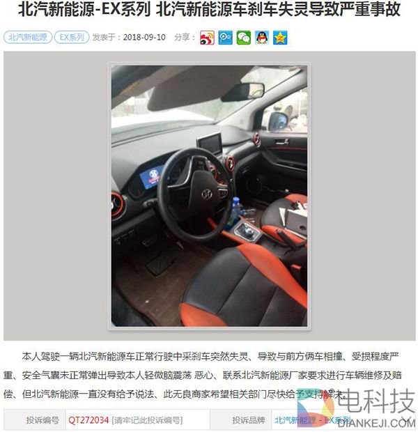 如上一则选自汽车投诉网的投诉显示,车主于2016年6月驾驶北汽新能源EV电动车过程中,就曾出现了刹车失灵并且造成了交通事故;