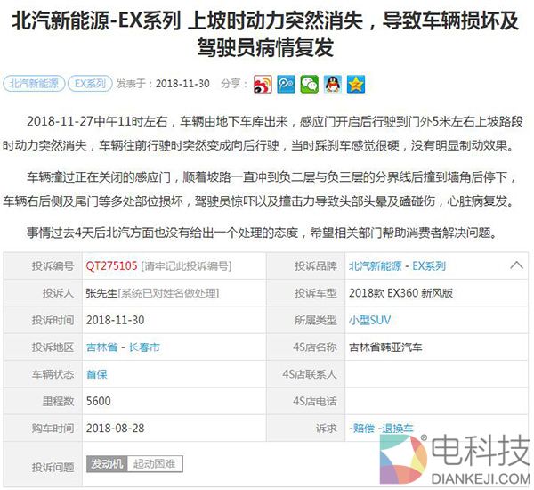 第三则投诉显示,车主驾驶北汽新能源EX系列在上坡路段突然动力消失,刹车变硬,没有明显制动效果,最后,车辆在停车场发生碰撞,导致车主头部头晕及磕碰,心脏病复发。