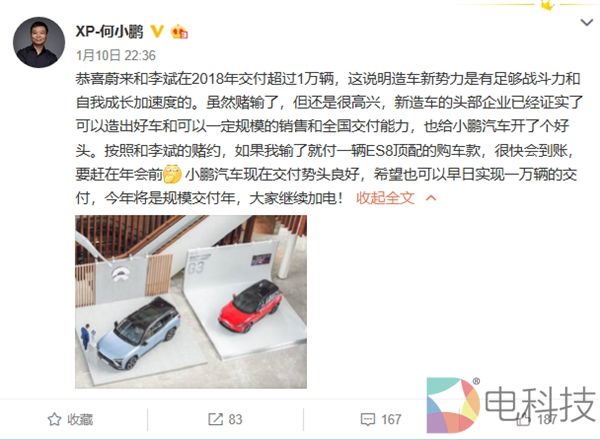 昨天蔚来汽车刚刚宣布2018年新车交付量破万,小鹏汽车创始人何小鹏就在微博上对此前与蔚来汽车创始人李斌立下的赌约大方回应:“虽然赌输了,但还是很高兴。”据悉在2018年8月时,小鹏汽车创始人何小鹏曾在微信朋友圈与蔚来汽车创始人李斌立下赌约:蔚来若年内完不成10000台车的交付李斌赔台车给何小鹏。