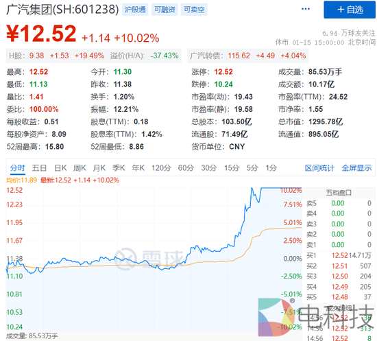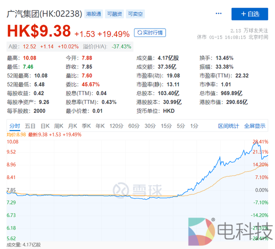 受消息刺激,1月15日,广汽集团A股涨停报收;港股也同步拉升,全天收涨19.49%。