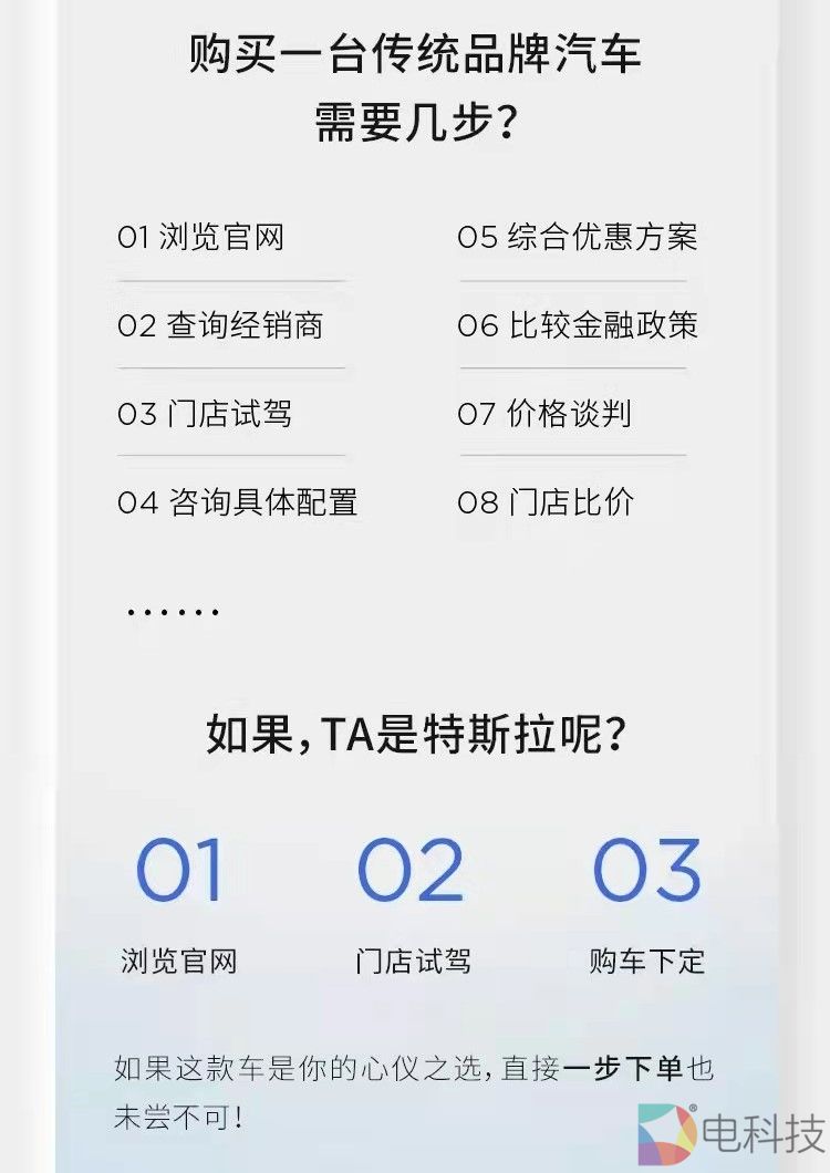 众所周知,特斯拉目前采用直营模式,在线下没有设立任何4S店,至于为何要选择该销售模式,今天特斯拉终于给出了官方回应。特斯拉表示,消费者购买一台传统品牌汽车,一般需要经过至少8个步骤,不仅要查询当地经销商,还要和销售进行价格谈判,若是贷款购车,还需要详细对比各家金融政策,实在是繁琐。