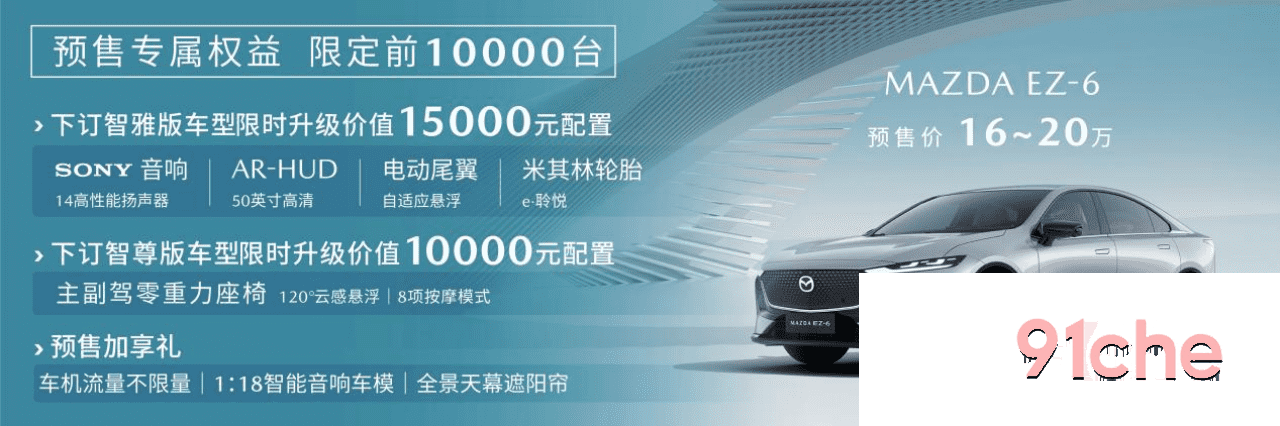 在超过一百年的品牌发展过程中,马自达以挑战自我、打破常规的技术研发精神,为全球用户带来了众多兼具设计之美、驾乘愉悦、匠心品质与卓越安全的惊艳之作。在电动化时代,马自达“以人为本”的品牌理念和“驾乘愉悦”的品牌精髓不会改变,马自达依然会是大家热爱的马自达。EZ-6此次16—20万的预售价,诚意满满,将合资B级轿车市场推向了全新的价值竞争维度,让用户能更轻松、更低门槛地拥抱豪华、舒适、快乐的智慧出行新体验。