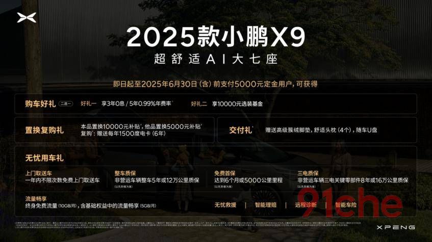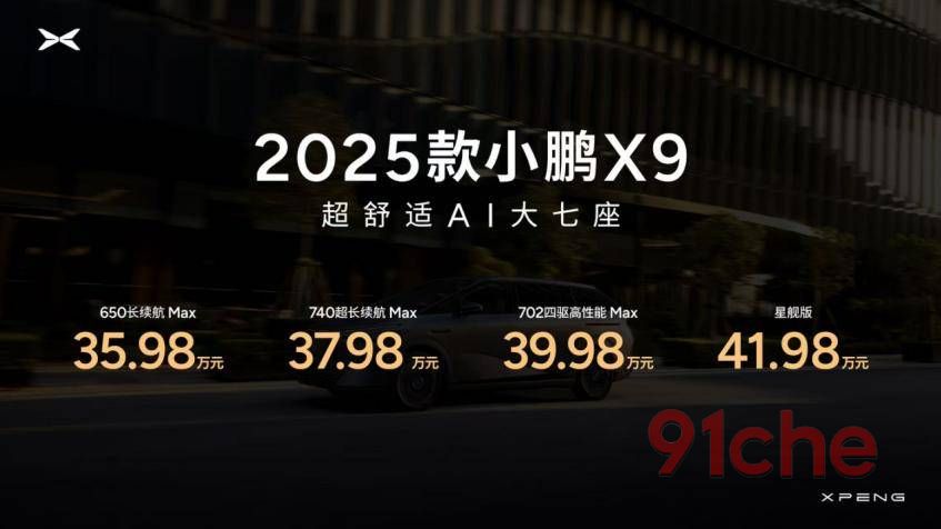 发布会上,全球旗舰、超舒适AI大七座2025款小鹏X9正式上市,新车共发布四个版本,包括650长续航Max、740超长续航Max、702四驱高性能Max以及星舰版,官方指导售价分别为35.98万元、37.98万元、39.98万元以及41.98万元。至2025年6月30日(含)前支付5000元定金的用户,可享购车好礼、置换复购礼、交付礼、无忧用车礼等多重上市订购权益。小鹏汽车还贴心回馈老款小鹏X9车主,通过硬件OTA的形式免费升级百万级的静谧性OTA套装、限时付费升级过道版零重力太空座椅套装、限时众筹升级流媒体内后视镜OTA套装以及智能电动遮阳帘OTA套装,诚意满满。