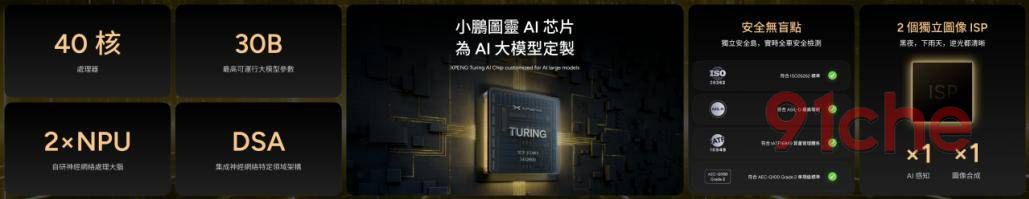 为匹配高阶AI智驾的算力需求,小鹏汽车全栈自研体系的核心技术成果——小鹏图灵AI芯片,专为大模型定制,自研神经网络处理大脑、单颗最高可跑30B(300亿)参数量的本地模型,算力是现有芯片的三倍,将于2025年第二季度在中国内地率先量产上车。