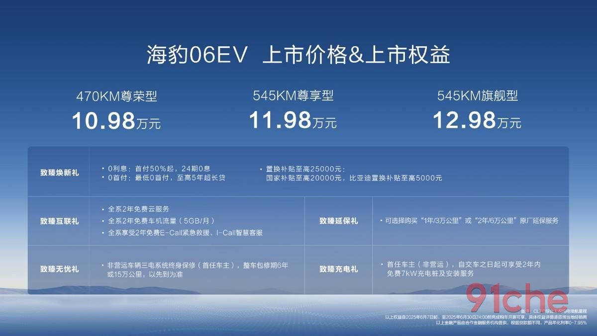 6月7日,比亚迪海洋网潮美质选轿跑海豹06EV于重庆车展上市。新车共推出3款配置,售价10.98万-12.98万元。并推出购车享致臻焕新礼、致臻互联礼、致臻无忧礼、致臻延保礼、致臻充