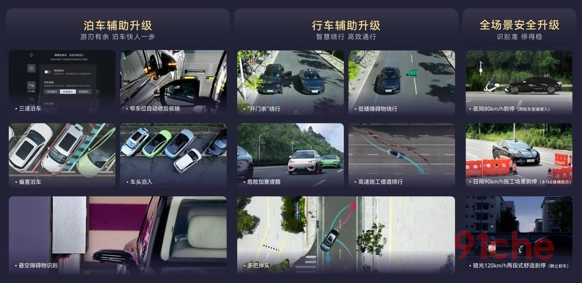 泊车方面,天神之眼新增三速泊车、车头泊入、偏置泊车、窄车位泊车自动收后视镜等功能,并优化了悬空障碍物识别功能,智能泊车又快又准又安全;行车方面,天神之眼可覆盖更多场景,如环岛通行、复杂场景连续绕行、高速施工路段借应急车道绕行、窄路多把掉头等,还新增前车加塞场景下的闪灯鸣笛提醒功能;安全方面,天神之眼AEB功能可更轻松识别低矮障碍物,在夜间80km/h情况下可实现对两轮车侵入车道紧急刹停,120km/h触发AEB也能做到两段式舒适刹停,为用户带来更为安全舒适的用车体验。