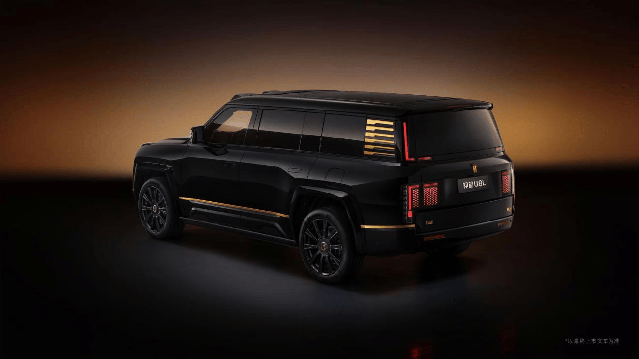 仰望U8L鼎世版车身长宽高分别为5400/2049/1921mm,轴距达3250mm。车身整体遵循“鼎立天地”的设计哲学,以方正线条勾勒出威严气场,大气磅礴、纵览四方。细节之处熏黑处理的前保险杠、极简式轮眉、车身同色的侧裙以及隐藏式尾灯,让车身设计更加简洁统一,高端行政气息自然流露。上下对开式电动尾门、 23英寸八孔锻造轮毂、悬浮轮心盖等专属配置让U8L更显大气、尊贵。