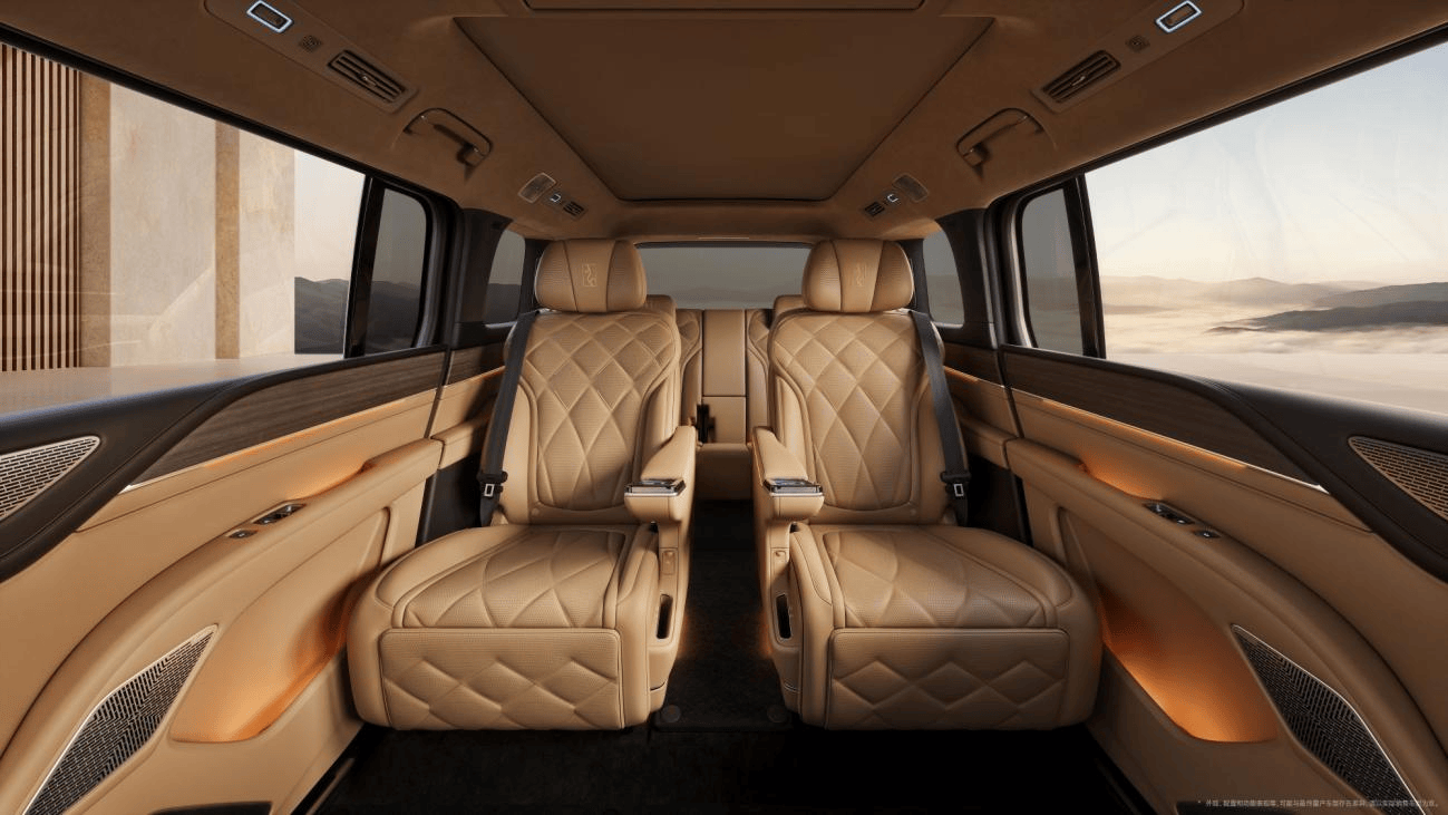 鼎世版四门门板与副仪表台处采用柚木或黑胡桃木的真木饰件,木材用料取自同一颗树最好的部分,纹理走势协调统一。真木历经27道道精细工艺手工打磨,木材表面润度提升至5度,指尖触碰时可感受到丝绸般的顺滑,完美平衡了高级质感与天然木纹的原始魅力。整车真皮采用顶级Nappa真皮,每张座椅精选完整无磨损的皮面制作,皮质历经鞣制、复鞣、涂饰等78道传统工序,柔软亲肤。座椅缝线灵感源自中国传统祥纹“菱格纹”,设计师对传统菱格单元进行了符合现代工艺的解构与重组,以横向编织、上下排铺的方式,构建出富有韵律的菱格纹矩阵。此外,新车还配有天然纯羊毛脚垫、麂皮顶棚、“鼎”式图案迎宾光毯等尊享配置,每一处细节皆是东方匠心的深刻诠释。