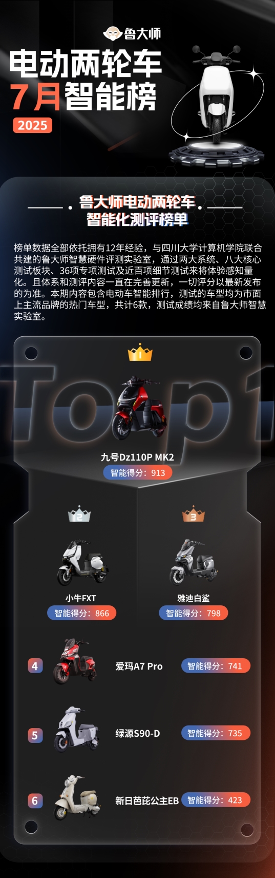 鲁大师7月电动两轮车排行榜数据来源于鲁大师智慧实验室,测评的车型均为市面上主流品牌的主流车型。截止目前,鲁大师智能化电动车测评的车型高达250余台,且还在不断增加和丰富