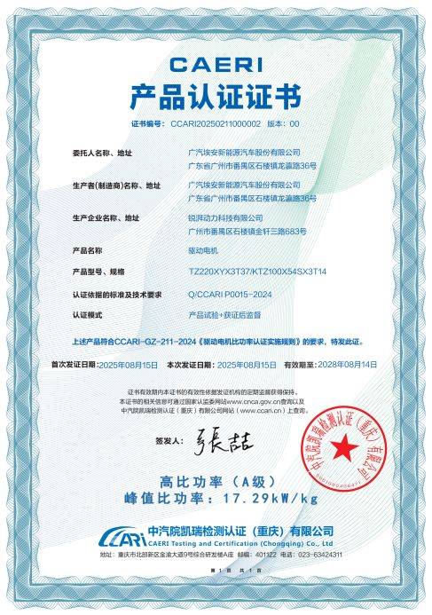 经中国汽研认证,广汽夸克电驱2.0驱动电机功率密度高达17.29kW/kg