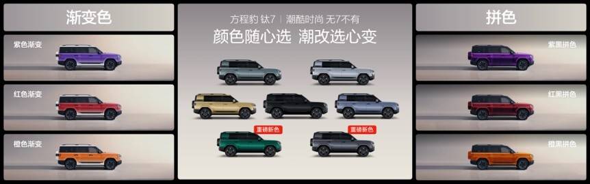 为了让广大用户选得尽兴,钛7直接一步到位,带来了7款外观颜色、3款内饰颜色,同步在官方商城上架了6款潮改方案,可满足不同用户的审美偏好。