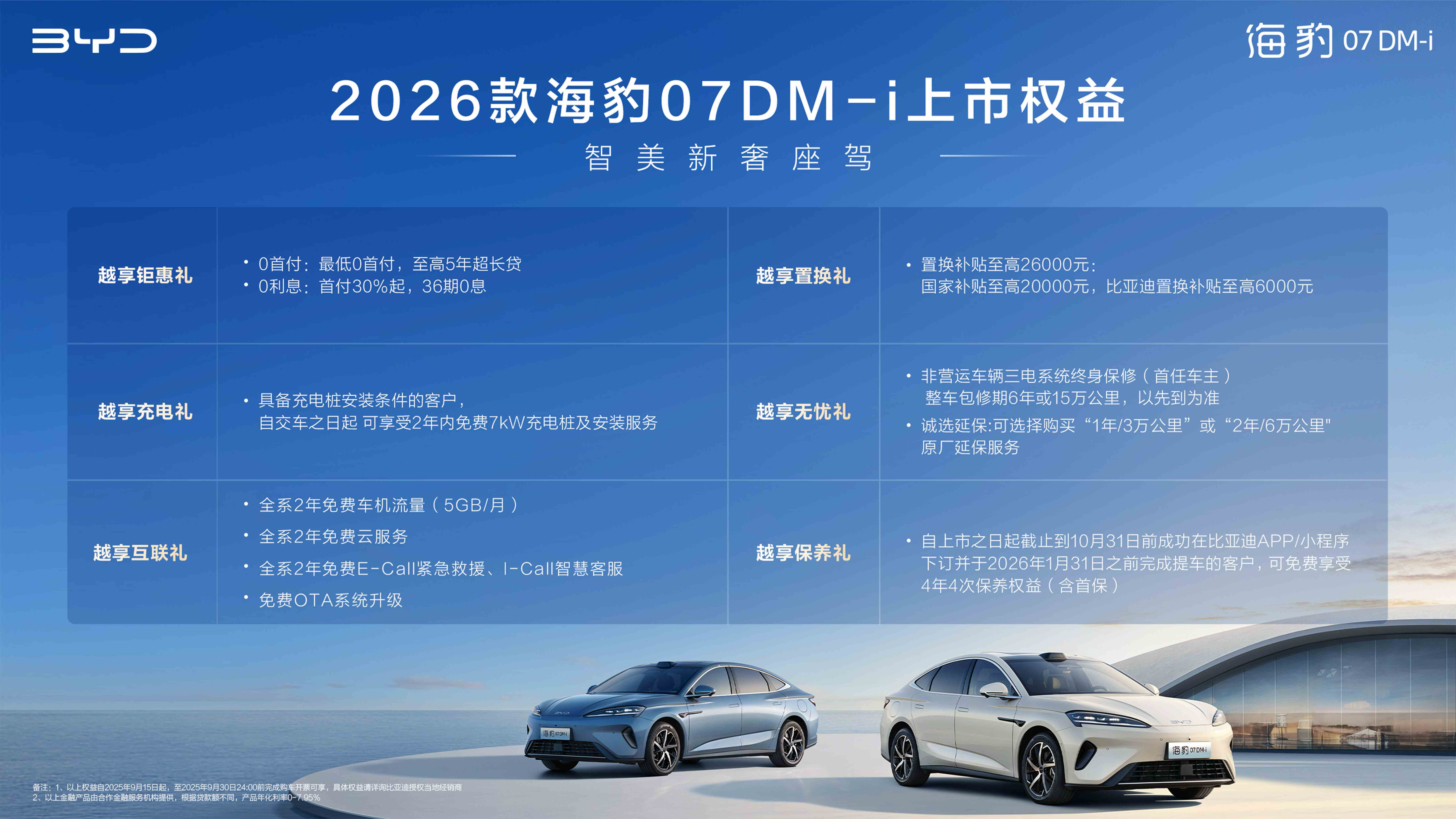 9月15日,智美新奢座驾——2026款海豹07DM-i正式上市,新车共推出4个配置版本,官方指导价格为14.98万元-18.68万元,并推出越享钜惠礼、越享置换礼等六重购车礼遇。2026