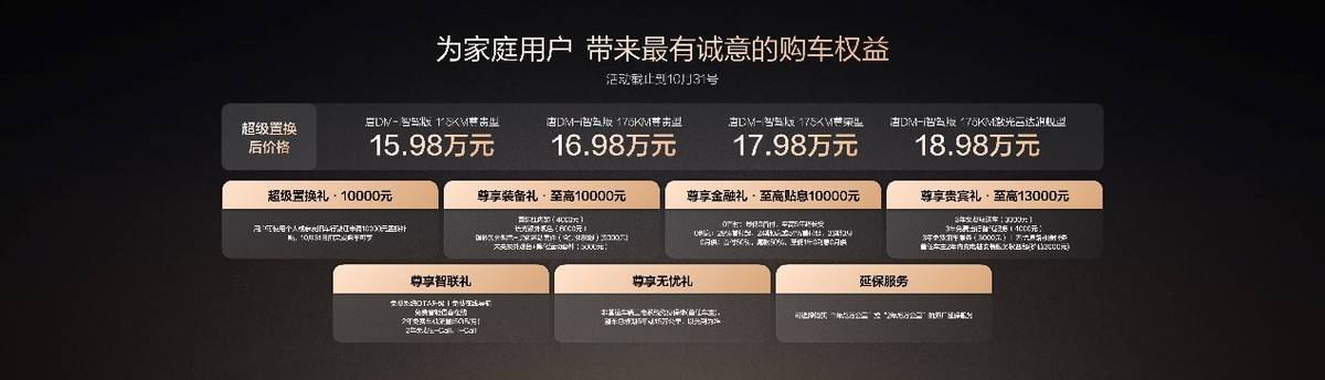此次,唐DM-i智驾版 175KM长续航版共推出3款车型,售价17.98万~19.98万元(10月31日前完成购车可享10000元置换补贴)。同时,比亚迪还为用户准备了包含置换补贴在内的至高价值4.3万元盛唐礼遇。