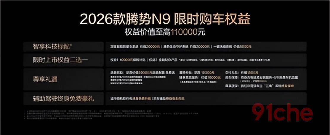 为回馈广大用户的支持与信赖,2026款腾势N9特别推出限时购车权益:10月31日(含)前提车的用户,全系可享10000元保险补贴或金融贴息(二选一),置换补贴至高10000元。此外,还有价值45000元的智享科技,以及辅助驾驶终身免费豪礼。根据不同款型,限时赠送极致性能套装、电动侧踏板、隐私声盾等科技豪华配置。智能电动门、吸顶屏套装、流媒体外后视镜以及双色车身均享限时选装价格,让豪华触手可及。详情敬请咨询腾势直营店及当地经销商。