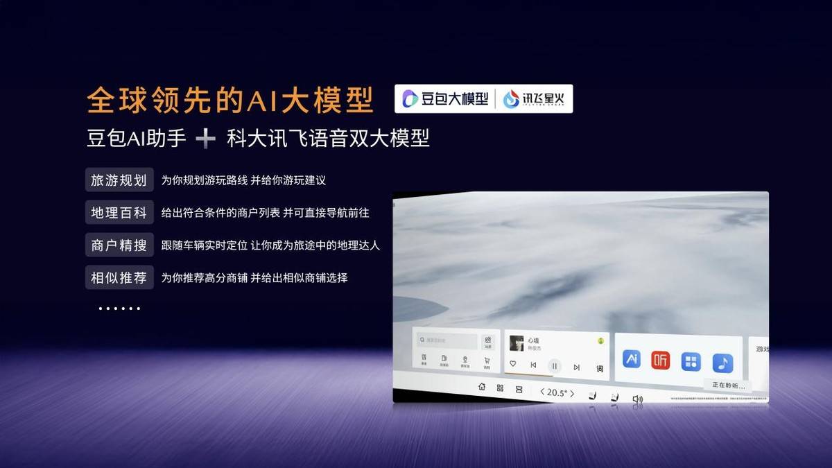 智舱平台内置豆包和讯飞星火两个AI大模型,不管是导航、控车,还是陪玩聊天,样样在行。豆包AI助手堪称一名称职的“随行生活顾问”,你的需要都能精准匹配解决方案。讯飞星火AI,则把人机交互体验做到了最好。主驾驶位采用“多模识别”技术,包含唇形检测+声源定位+音区锁定三大技术,即使车里放着音乐,也能精准识别你的指令。智能管家全时免唤醒,直接说指令,它就会立刻执行。