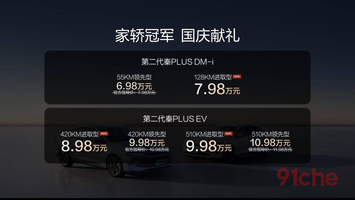 9月25日,比亚迪第二代秦PLUS双车上新,发布了秦PLUS DM-i 128KM进取型、秦PLUS EV 420进取型、510KM进取型等三款新车,同时全系车型享国庆献礼价,限时6.98万元起。秦PLUS是目前A